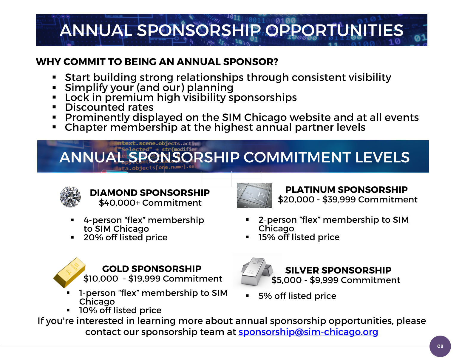 Premier Events To learn more about SIM Chicago's Summit you can click here: To learn more about SIM Chicago’s 19th Annual Golf Outing, you can click here: ![]() Annual Sponsorship At SIM Chicago, we aim to build mutually advantageous and long-term sponsorship relationships. Many of our sponsors have found the best way to do this is through annual sponsorship, that allows our partners to put together a curated combination of events and target audiences to advance the interests of their organization. We would welcome the opportunity to have a conversation with you and discuss the benefits of Annual Sponsorship of SIM Chicago.![]() Available Sponsorships The following sponsorship opportunities are available: Color key: